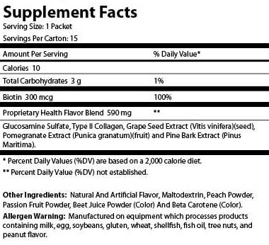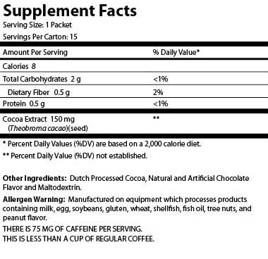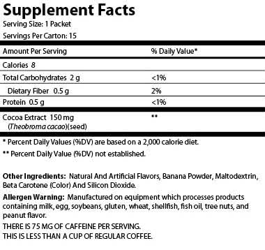 Each packet is not just a flavor, they are concentrated nutrition! Chocolate Cardia Care has polyphenols, which are great antioxidants and support heart health. Chocolate Cardia has about the equivalent of 6-8 bars of dark chocolate for only a few calories. Banana Energy Charge has guarana power to provide a burst of energy that lasts. Strawberry Phyto Power has about 50 strawberries worth of phytonutrient protective power per packet. Peach Complexion Care has glucosamine, biotin, collagen and more to support healthy skin and healthy joints. Orange Everyday Defense has immune and detox supporting ingredients.